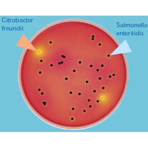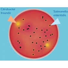 Благодаря образованию сероводорода (тиосульфат и ионы трехвалентного железа) сальмонеллы легко обнаруживаются по черному цвету колоний на красно-фиолетовом фоне среды и легко отличаются от других бактерий. E.coli образует желтые колонии на желтом фоне среды вследствие подкисления среды (индикатор – феноловый красный). Другие сопутствующие микроорганизмы, например, Shigella, не образующие сероводорода, образуют бесцветные колонии на красном фоне среды.